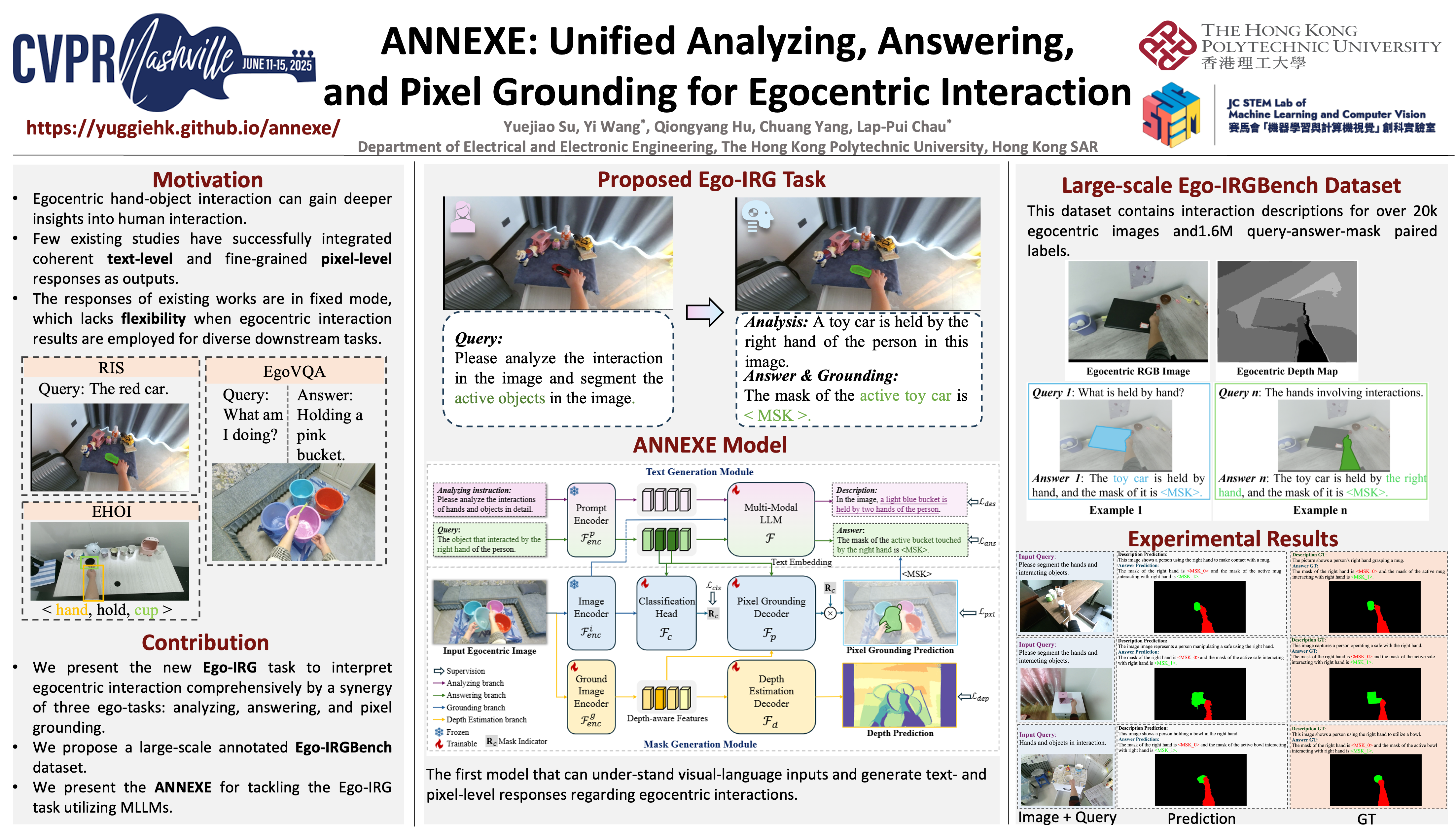 Egocentric interaction perception is one of the essential branches in investigating human-environment interaction, which lays the basis for developing next-generation intelligent systems. However, existing egocentric interaction understanding methods cannot yield coherent textual and pixel-level responses simultaneously according to user queries, which lacks flexibility for varying downstream application requirements. To comprehend egocentric interactions exhaustively, this paper presents a novel task named Egocentric Interaction Reasoning and pixel Grounding (Ego-IRG). Taking an egocentric image with the query as input, Ego-IRG is the first task that aims to resolve the interactions through three crucial steps: analyzing, answering, and pixel grounding, which results in fluent textual and fine-grained pixel-level responses.Another challenge is that existing datasets cannot meet the conditions for the Ego-IRG task. To address this limitation, this paper creates the Ego-IRGBench dataset based on extensive manual efforts, which includes over 20k egocentric images with 1.6 million queries and corresponding multimodal responses about interactions. Moreover, we design a unified ANNEXE model to generate text- and pixel-level outputs utilizing multimodal large language models, which enables a comprehensive interpretation of egocentric interactions.The experiments on the Ego-IRGBench exhibit the effectiveness of our ANNEXE model compared with other works.